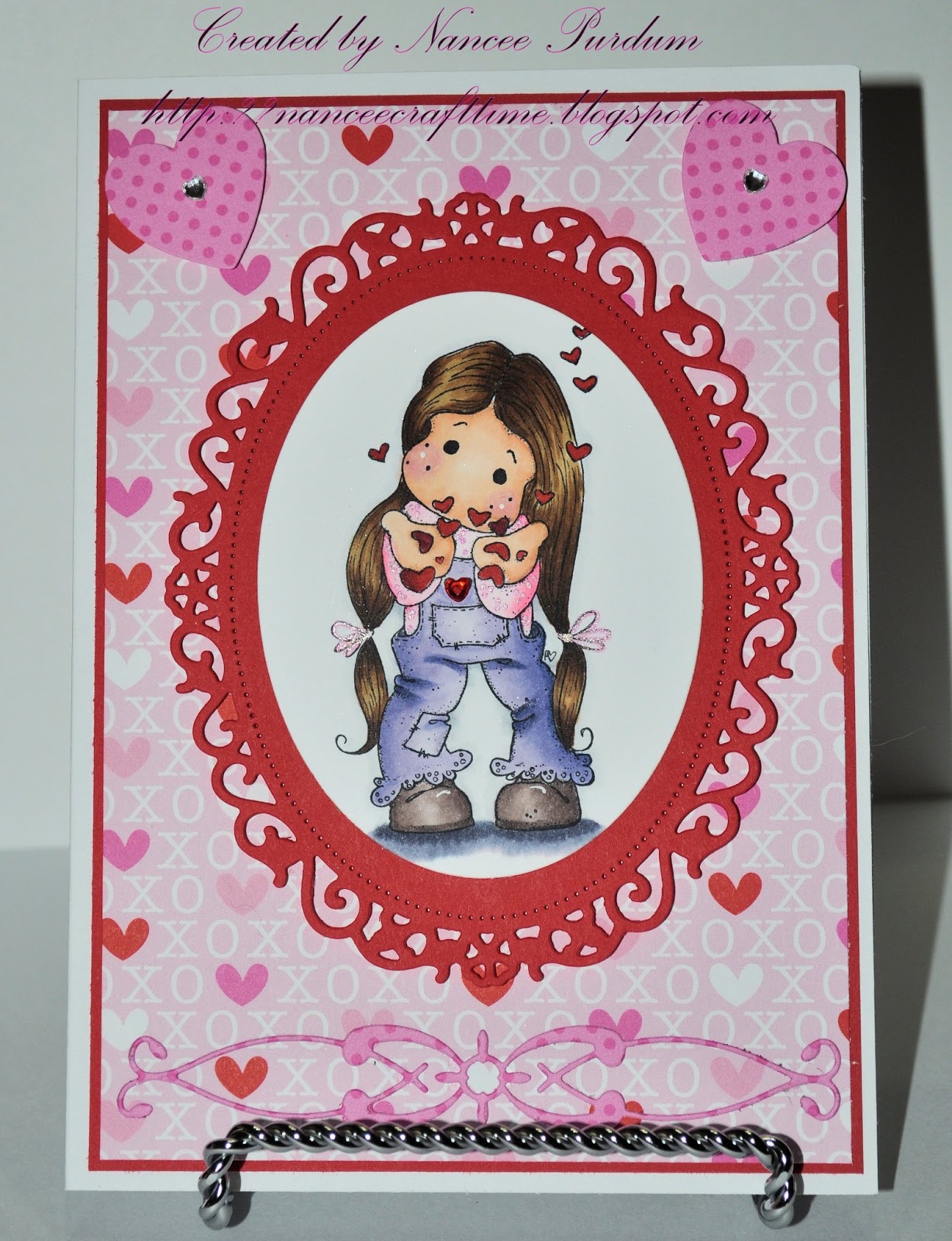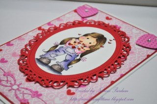 For the Valentine card, I did write down the Copic markers I used. I used some paper and some white and red crystal hearts that I had on hand. The smaller heart die is from Stamp In Up, and the larger die is from Spellbinders.