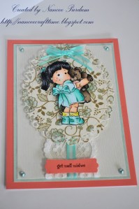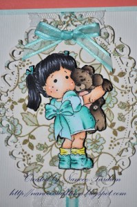 I colored the image with Copic markers. These are the colors I used: Skin – E000, E00, E21, E11, R11; Clothes – BG000, BG11, BG13, BG15, Y000, Y00, Y02, and Y04. The Teddy Bear is colored using R11, R20, E43, E44, E47, and E49. Tilda’s hair is done with C1, C3, C5, C7, and C9. I used a sentiment from Stampin Up. My paper is from Linen Closet by DCWV.