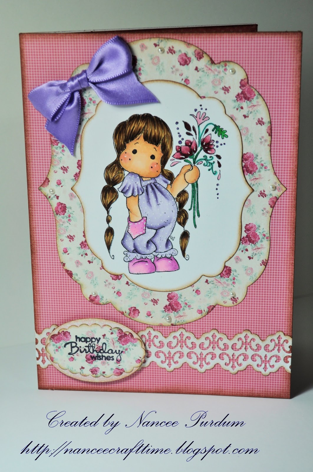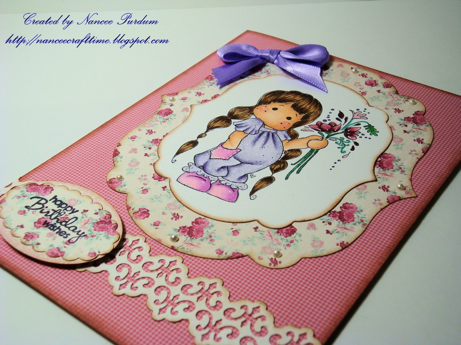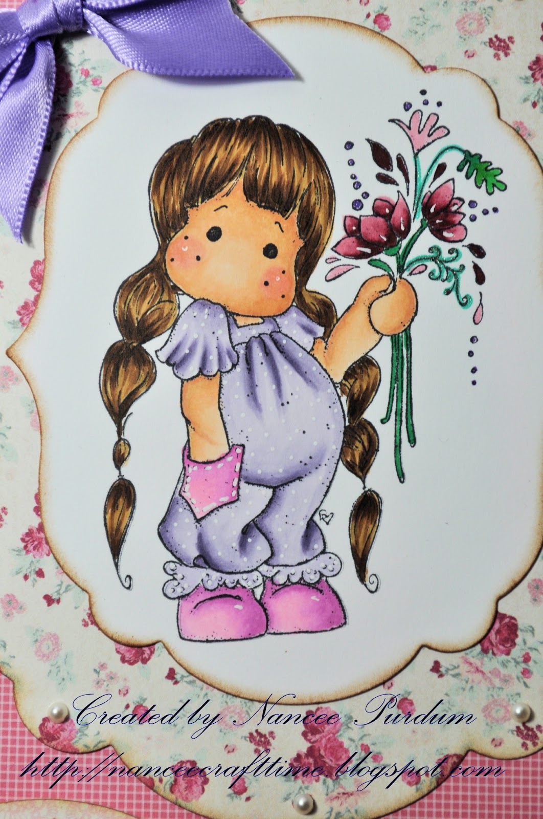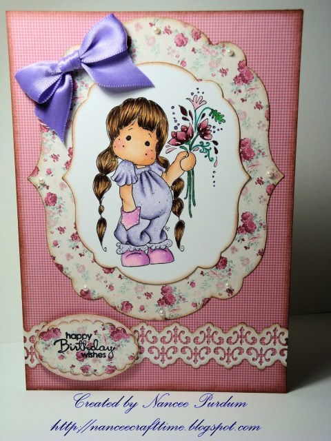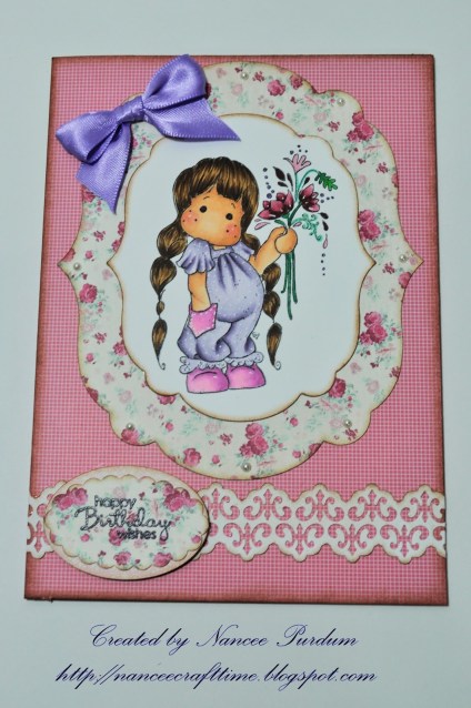 I’ve had Tilda With A Pocket for awhile, but haven’t had a chance to color her.  I love this image!  (I think I love them all!  LOL!)  I colored her with my Copic Markers and mounted her on two different sizes of Stampin Up’s Framlits Labels.  I used an EK punch and Distressed Ink to make the lacy border.  (Thanks Norma for the idea!)