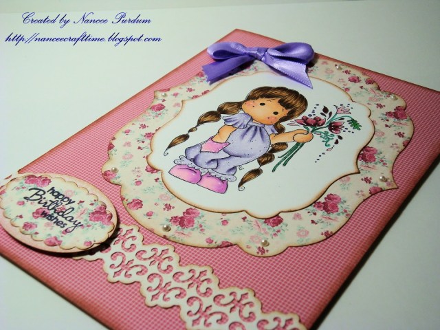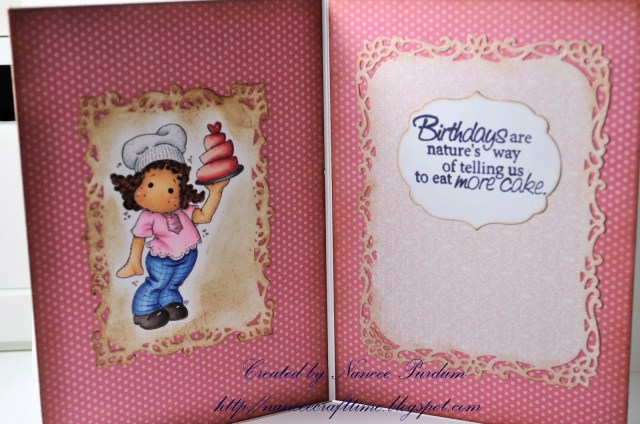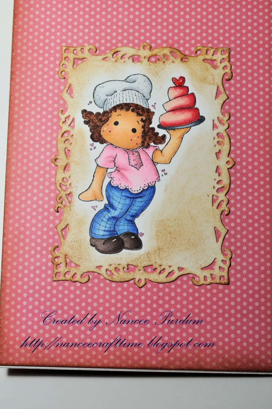 I used Tilda With Love Cake and used Spellbinders Decorative Labels Eight to cut her out.  I used Distressed Ink on the background, but am not really happy with it.  (Too late now!)
