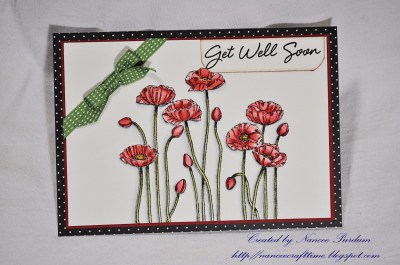 I tried the same technique as I did yesterday, water coloring with distress markers.  This time, I used a different stamp from Stampin Up, Pleasant Poppies.  I had used this stamp before for a thank you card, but used Copic Markers to color the image.  You can view that card here Thank You Card