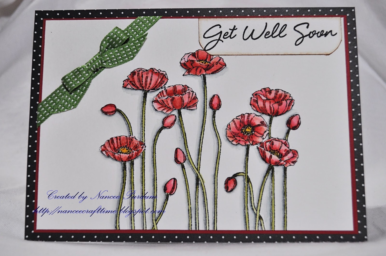 I tried the same technique as I did yesterday, water coloring with distress markers.  This time, I used a different stamp from Stampin Up, Pleasant Poppies.  I had used this stamp before for a thank you card, but used Copic Markers to color the image.  You can view that card here Thank You Card