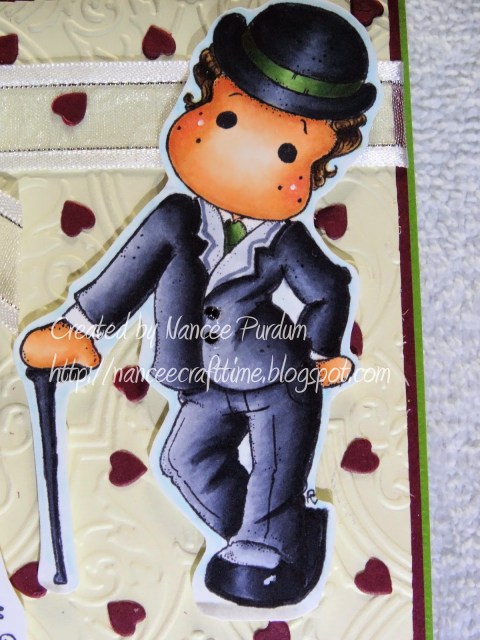 My niece seems to be going to a lot of weddings lately. She asked me to make her another wedding card. I decided to use two different Magnolia images, Wedding Tilda and Edwin with Derby Hat. I tried to use the colors of the wedding party to make it a one of a kind card for the bride and groom. I used an Anna Griffin embossing folder, Pirouette to emboss the background. This is one of my favorite embossing folders for backgrounds.