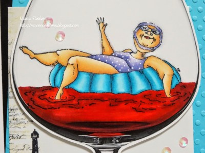 I used Seniorita Harriet and stamped her into a clip art image that I resized. I colored her in (and the wine) with my Copics. Don’t you just love her??? I had some paper from the last Simon Says Stamp card kit that went perfectly with the challenge. I added a label from PrettyPink Posh, Stitched Labels 1 with a sentiment that I created in Word. I added a little Vintage Photo Distress Ink to the die cut and some Darice Iridescent Sequins from Simon Says Stamp. I embossed some blue paper with an embossing folder, cut out the wine glass, added some glue and I was done!
