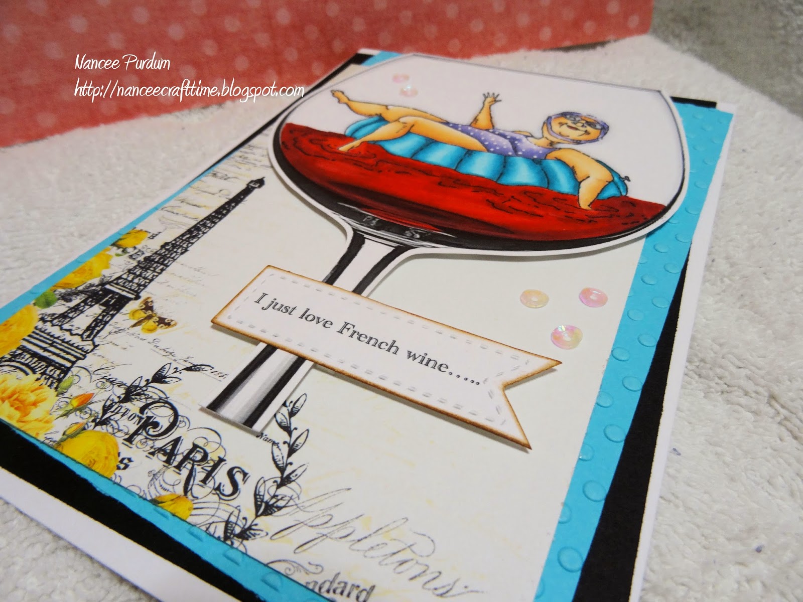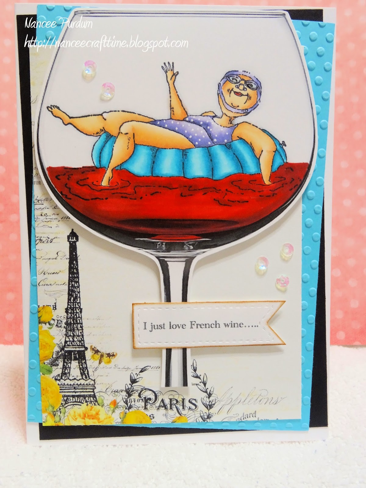 The challenge is to make a card using one of their stamps and then either a monotone card, or use a wine glass, or Paris, or any of these things…….so…..here is the image that popped into my head. LOL!