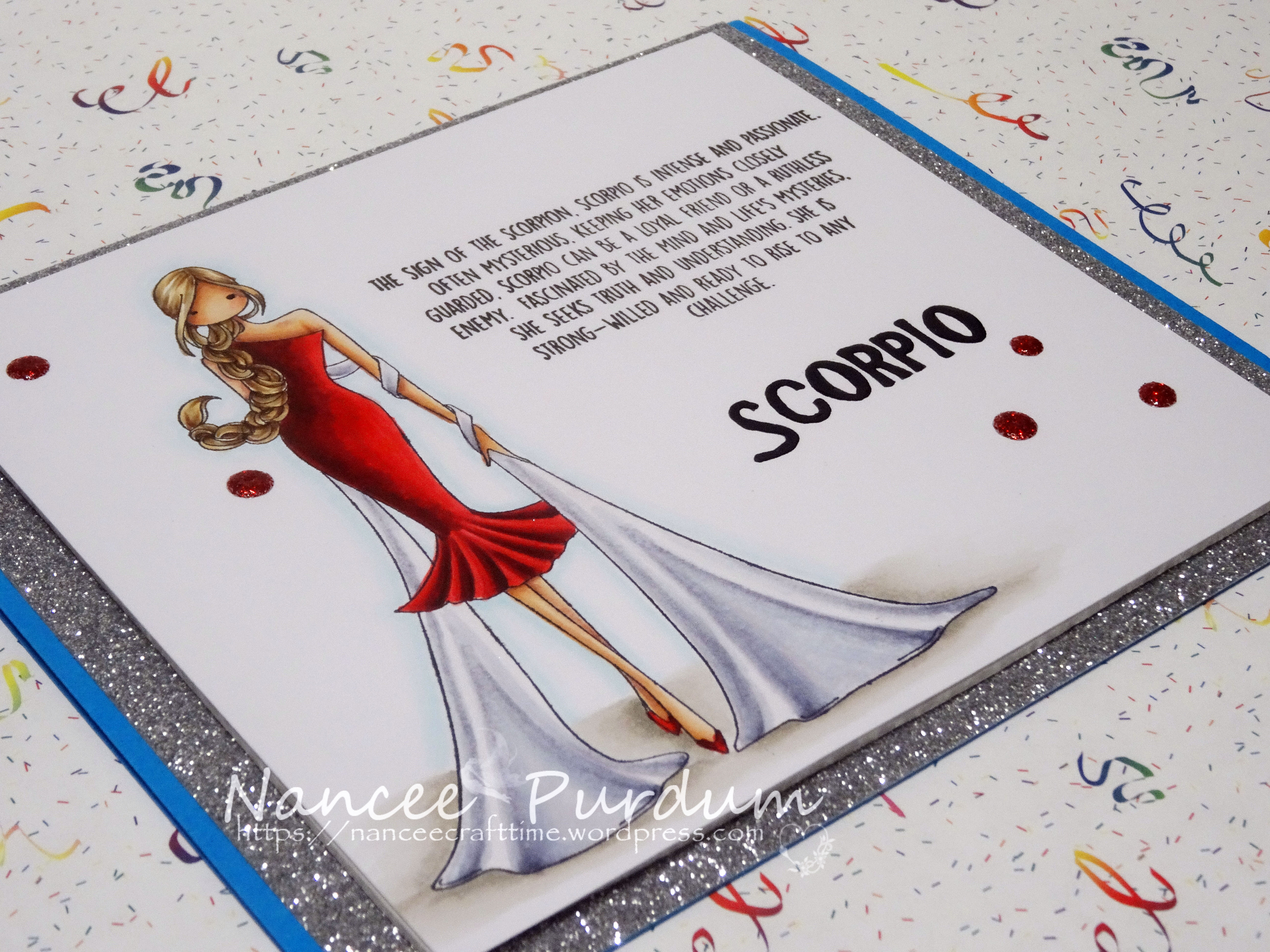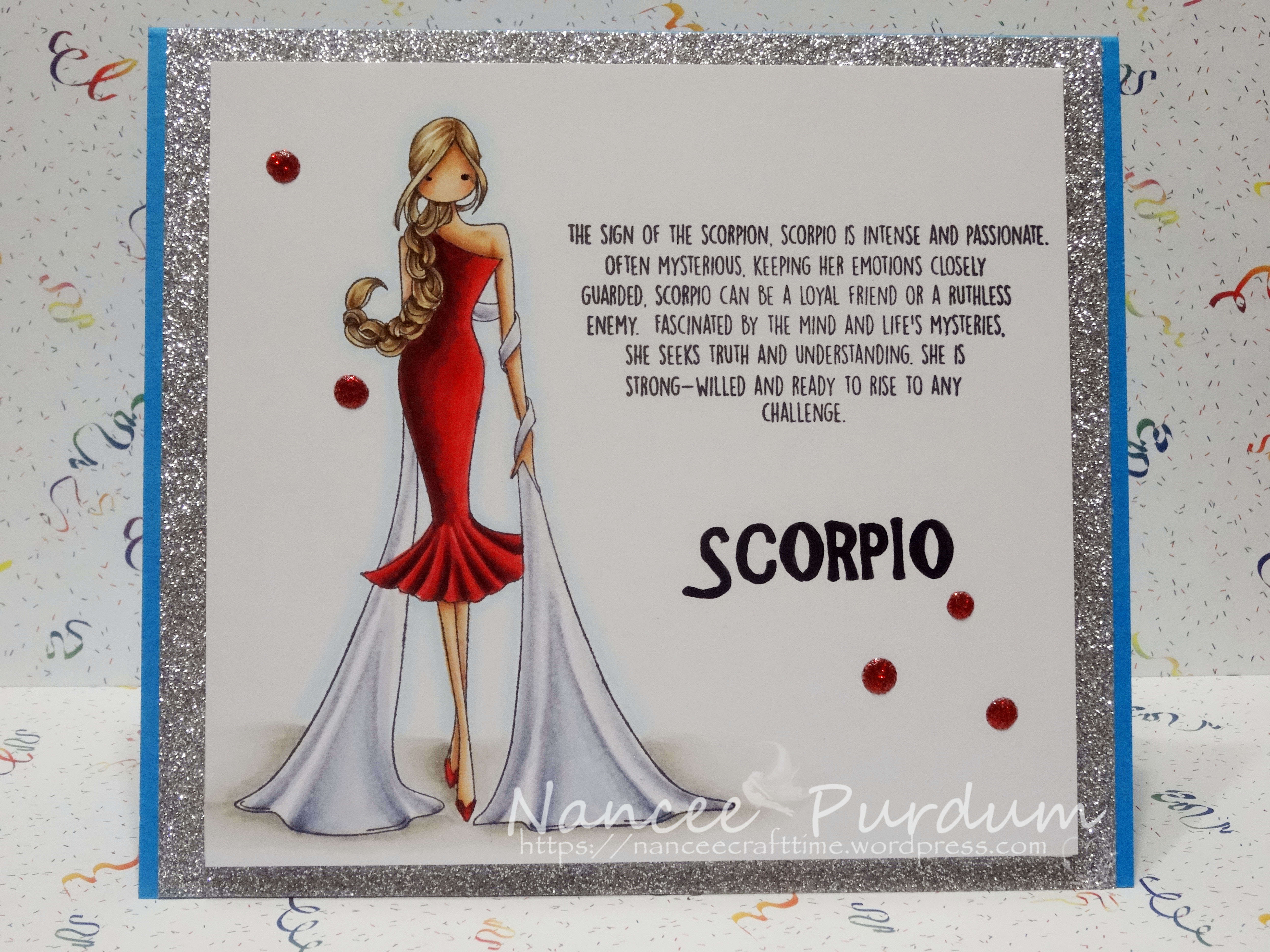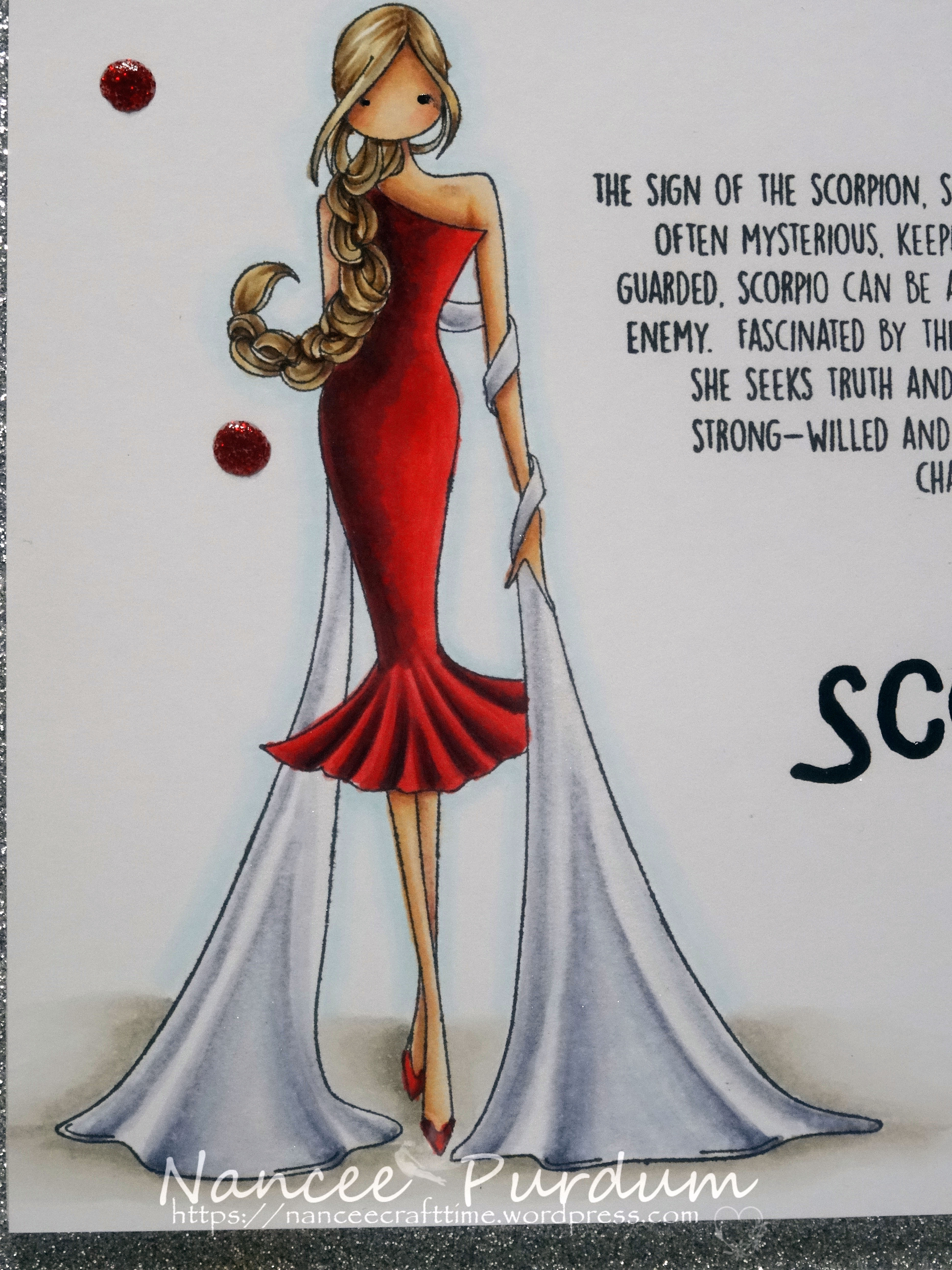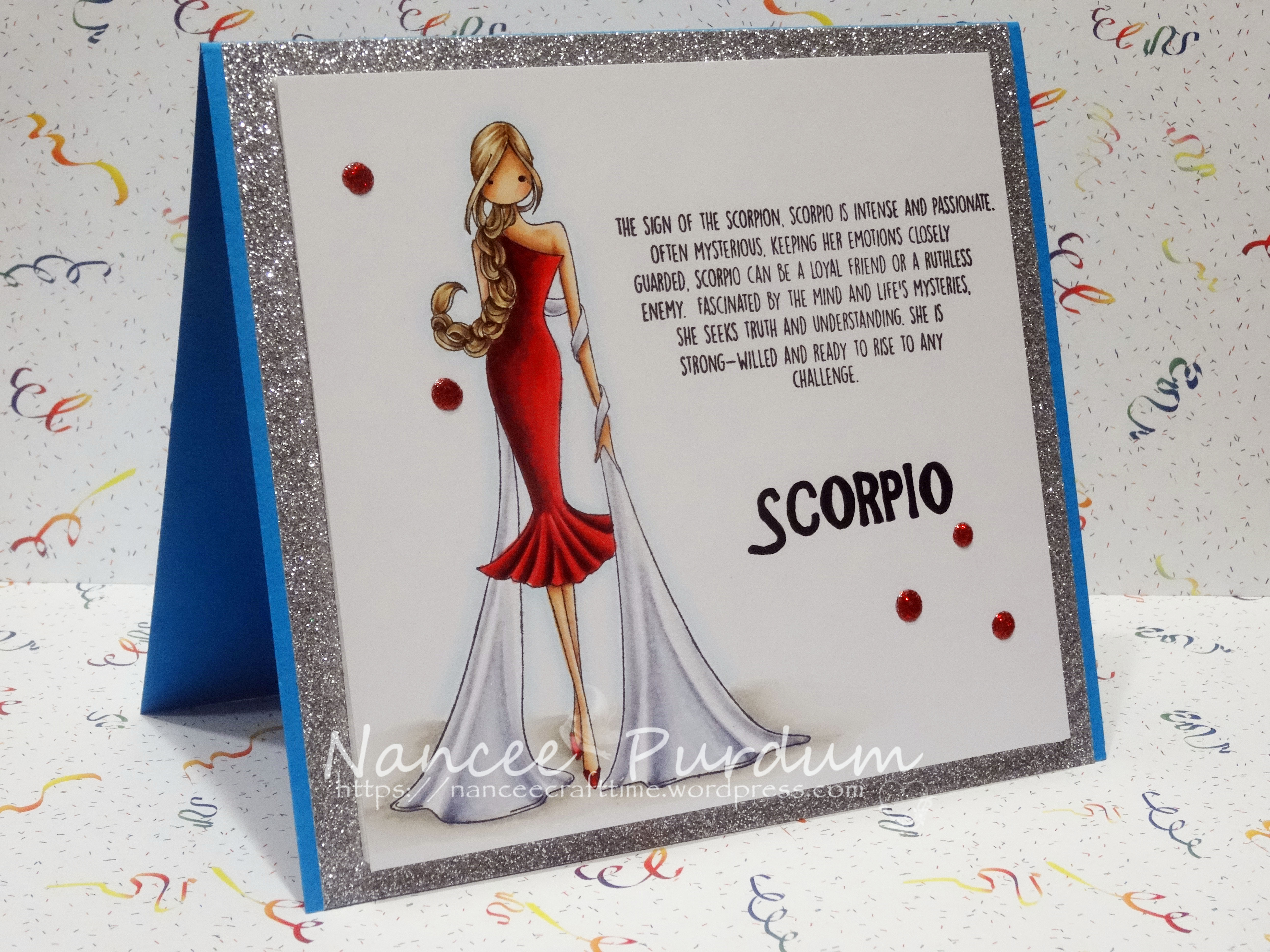 I love this image, and the wording is perfect! The image is Uptown Zodiac Girl Scorpio by Stamping Bella. I stamped the image and sentiment using Memento Tuxedo Black ink. I went over the “Scorpio” using my Black Glaze Pen. The image was colored with my Copics.