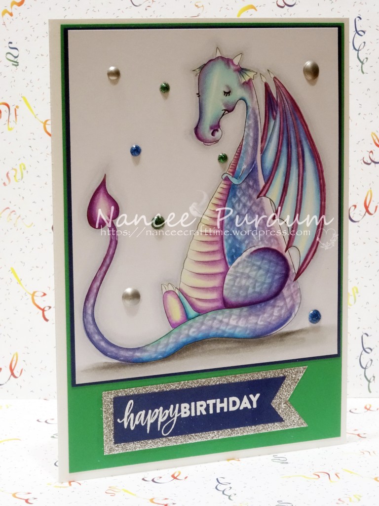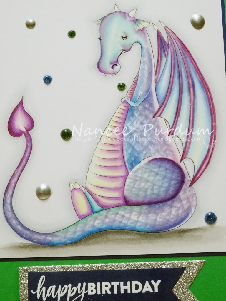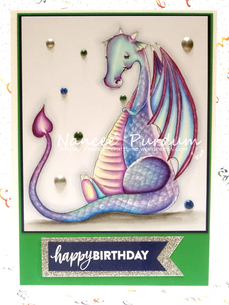 This was my first attempt at coloring a dragon and was very happy with the results. I did not keep track of the colors I used. I mounted the colored image on some dark blue card stock and then onto a green card base.