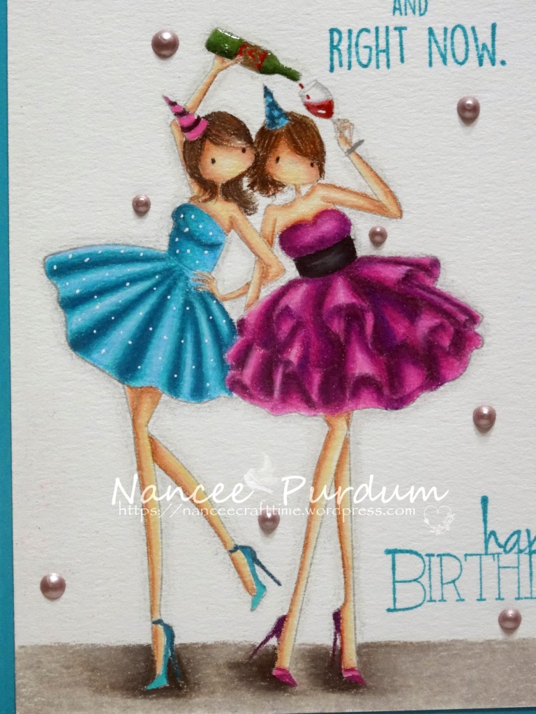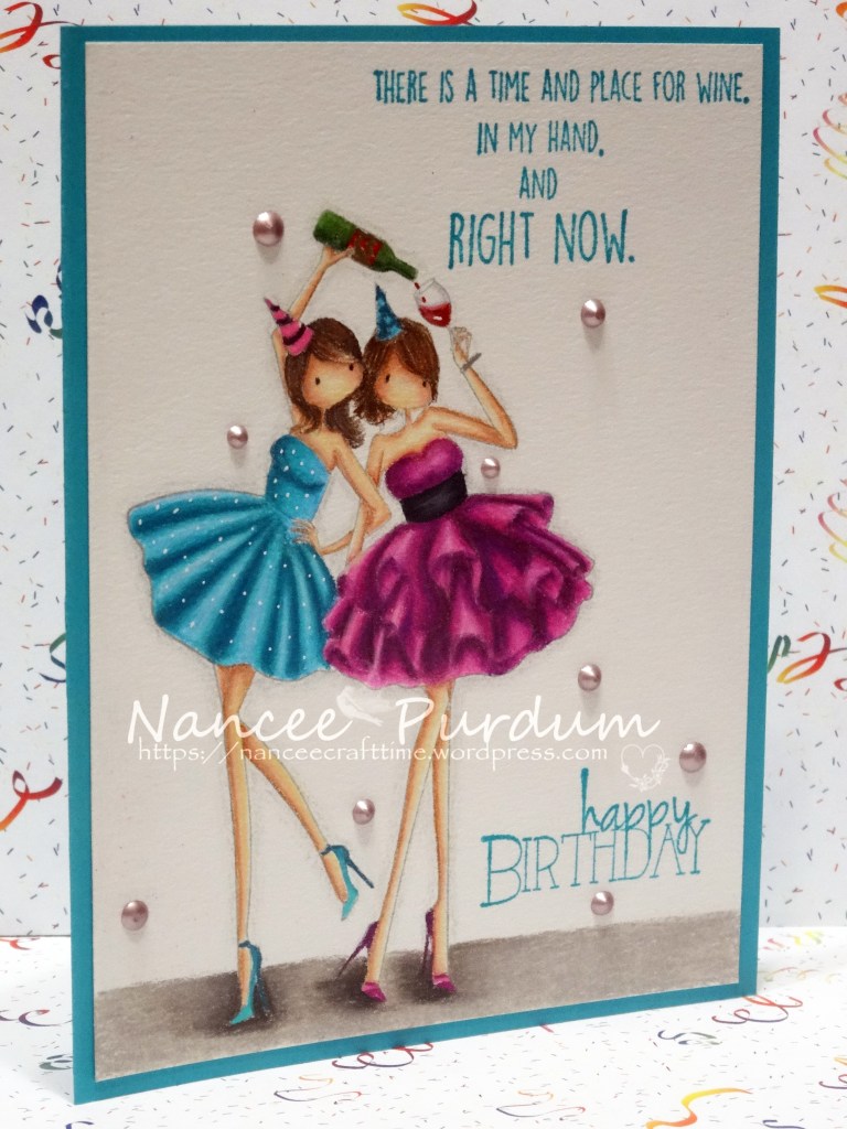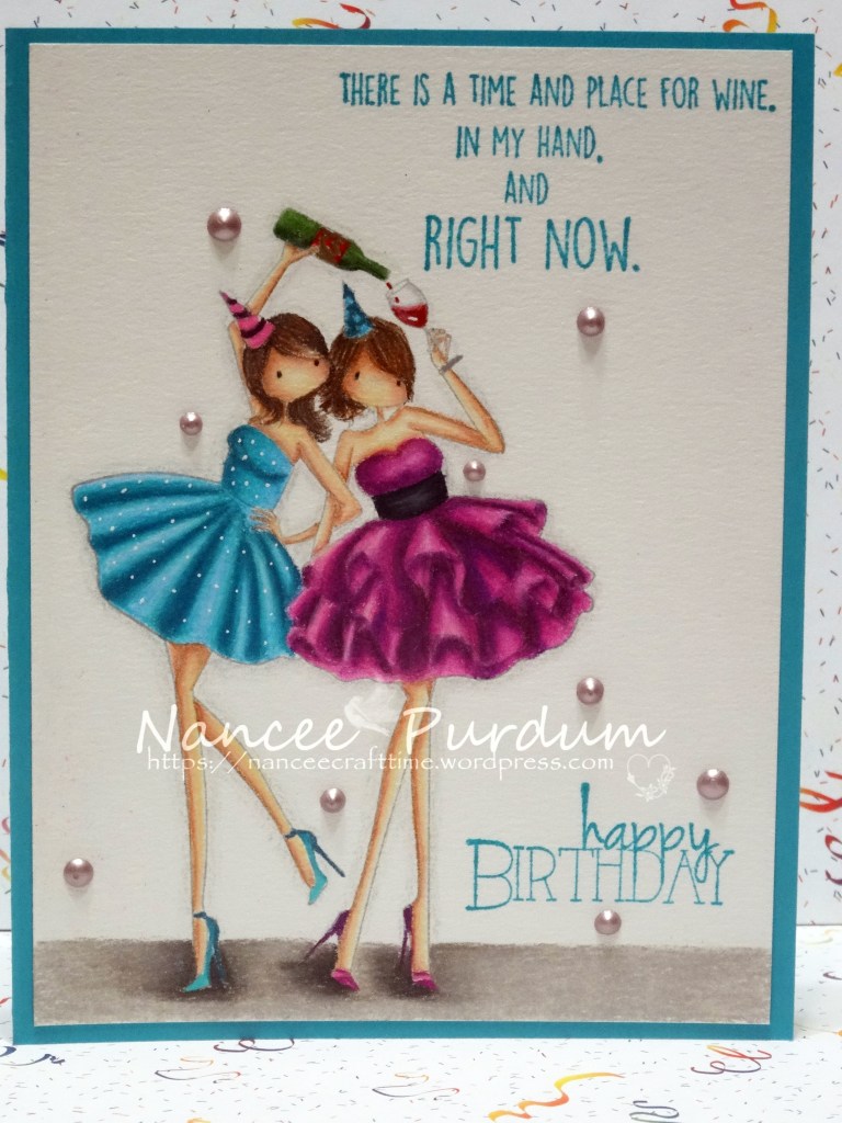 This was a fun image to color. I mounted the image on Gina K card stock, Blue Lagoon. I also stamped my sentiments in Blue Lagoon matching ink, also from Gina K. I added some Raspberry Pink Nuvo Drops and a few details with a white gel pen. I also added some glossy accents to the wine bottle.
