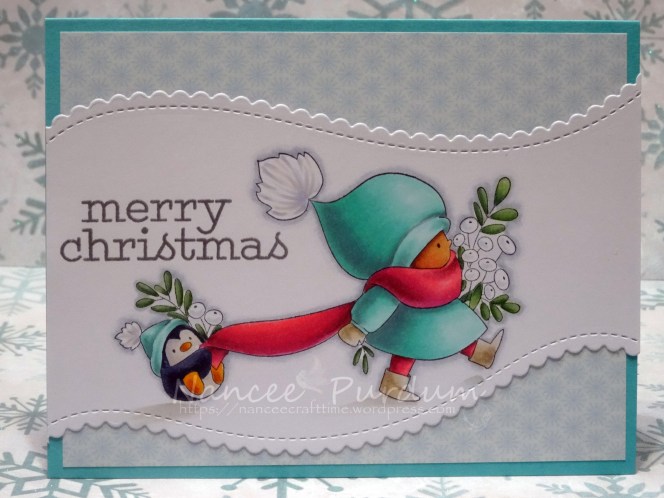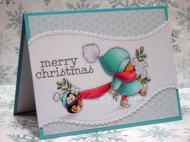 After coloring the image, I trimmed it down using the Stitched Scallop Basic Edges 2 from My Favorite Things. I love that I could adjust the dies to go with the flow of the image. The Merry Christmas sentiment is from Holiday Greeting Mix from Simon Says Stamp. I heat embossed it using Gina K’s Fine Detail Silver embossing powder.