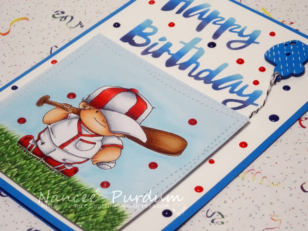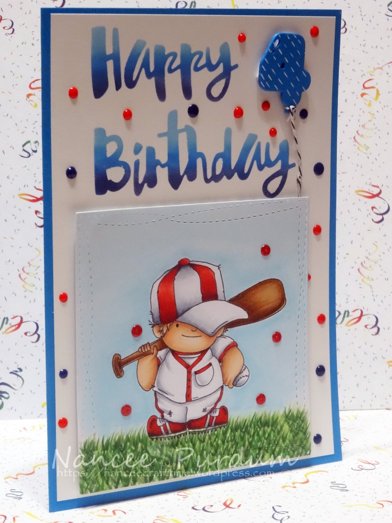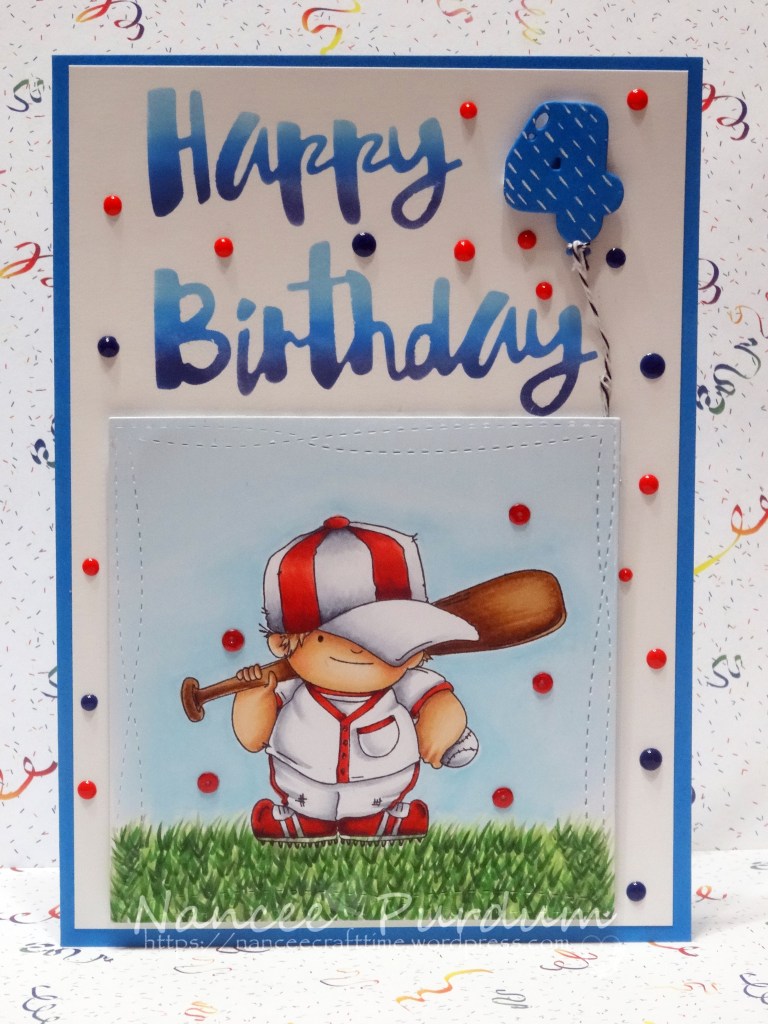 I stamped the image in Memento Black ink and used my Copics to color the image. I used reds for the uniform as I know he is a Boston Red Sox fan and red is their color.