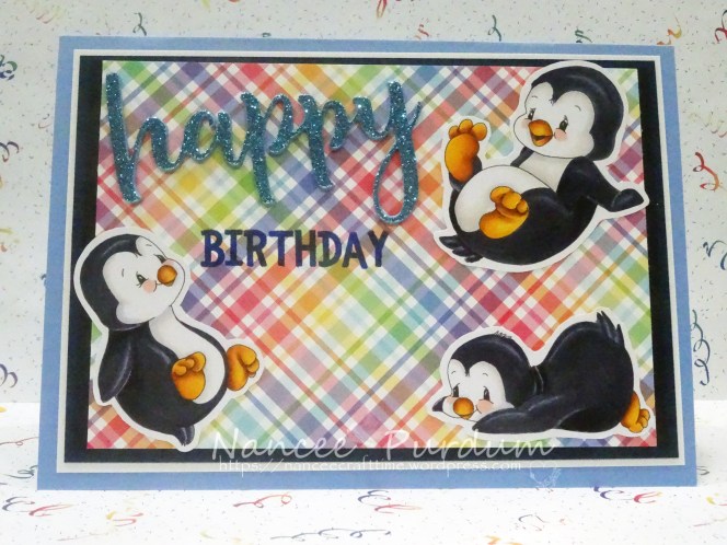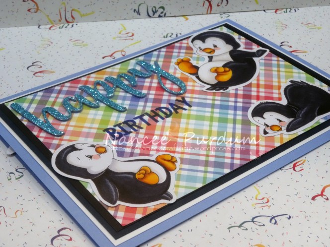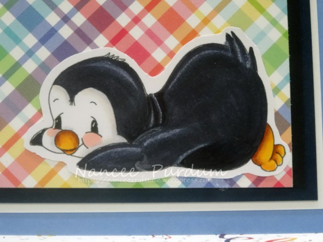 My grandson recently turned 5! I wanted to make a special card for him. For my card, I used several digital stamps from Whimsy Stamps, Penguin Flies, Penguin Slides A-B-C, and Penguin’s Cake.