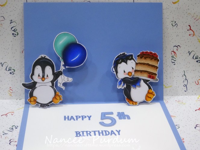 Since it was my grandson’s birthday card, I wanted to add a surprise to the inside of the card for when he opened it. I added the two remaining penguins to the inside so that when he opened the card they popped up.