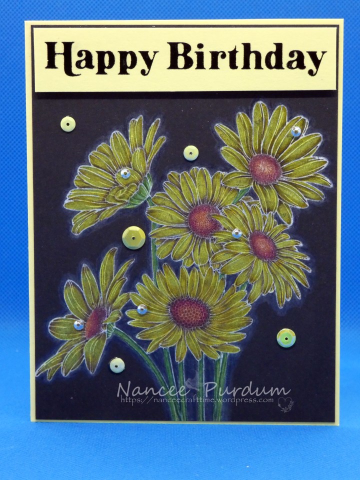 A little something different today. I used a stamp from a stamp set and my Polychromo pencils. I also used black cardstock, something I haven’t used in awhile. The stamp is from Simon Says Stamp, Daisy Bouquet. I stamped the image using white ink from Ink on 3. I love this ink. I have used […]
