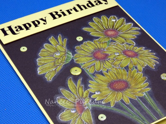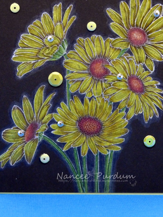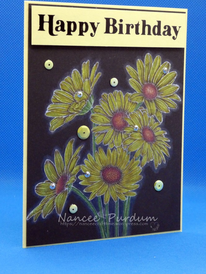 The stamp is from Simon Says Stamp, Daisy Bouquet. I stamped the image using white ink from Ink on 3. I love this ink. I have used several different white inks and always seem to have problems being able to see them. This ink was perfect! I used my Polychromo pencils to color in the image.