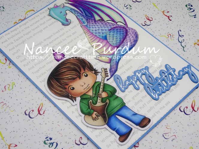 This card takes me back to my childhood. I have an uncle who plays the guitar and some of my favorite childhood memories of listening to him play the guitar and sing “Puff the Magic Dragon” (by Leonard Lipton and Peter Yarrow). For his birthday, I wanted to bring some of those childhood memories forward.