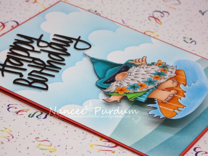 I love Gnomes! This is an adorable stamp from Stamping Bella, Gnome Riding the Waves.