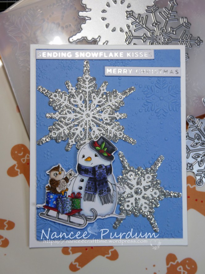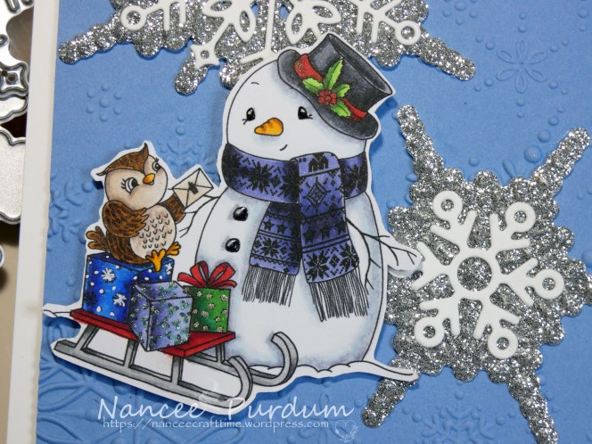 Fab colouring of that sweet snowman, Nancee. Great texture from the embossed background and lots of pretty sparkle too…