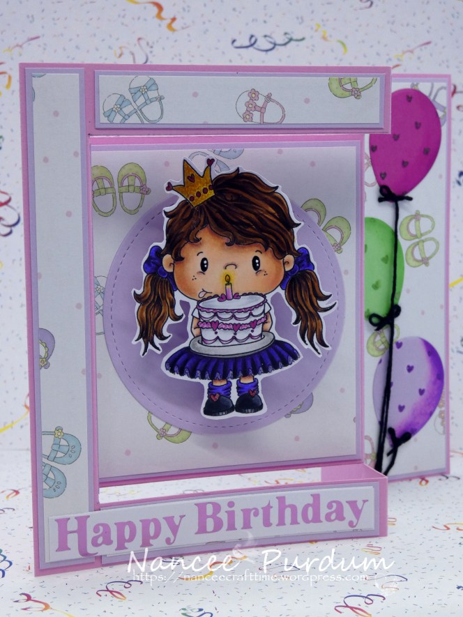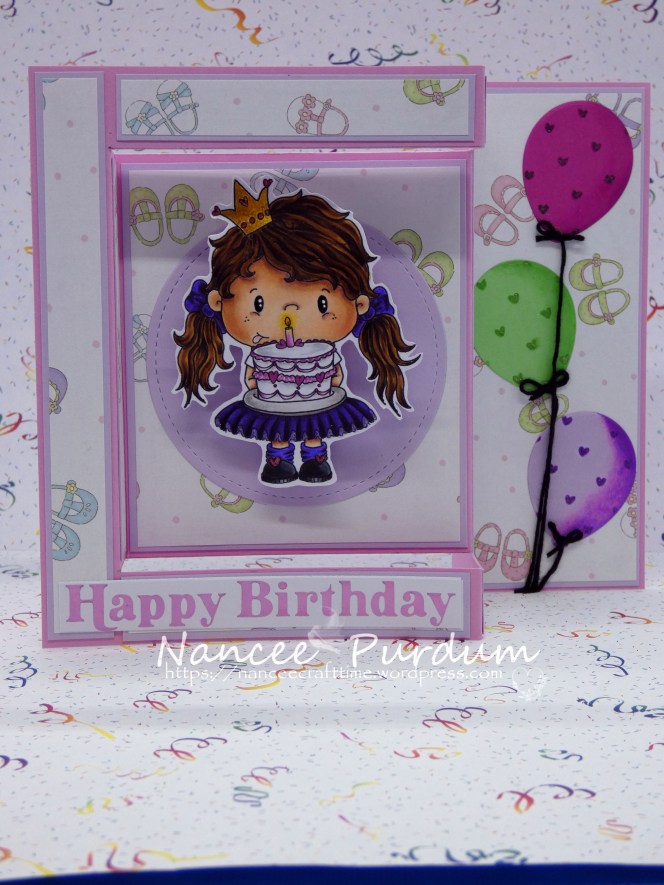 For my image on this card, I used Princess (a digital stamp) by Whimsy Stamps. She is perfect for a little girl’s card. After coloring her with my Copic markers, I cut her out as with my last card, I wanted to add an Action Wobbler so she had some movement.