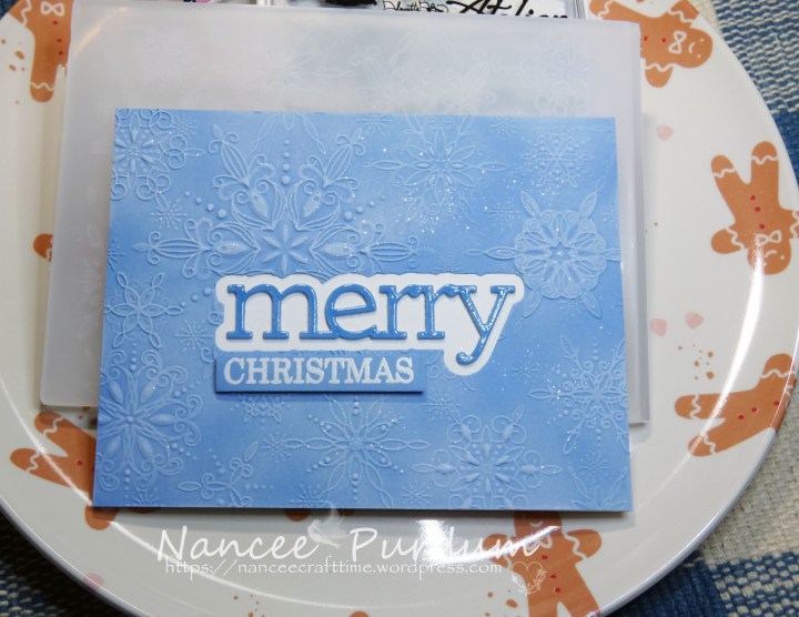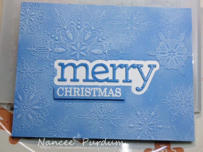 Since I make so many of the same design, I found one that Jennifer McGuire had made and added my own twist. I first used the shadow die for Merry to cut out the middle of my card stock. I then used the Filigree Snow Flakes embossing folder from Simon Says Stamp after rubbing the back of my card stock with a baby wipe.