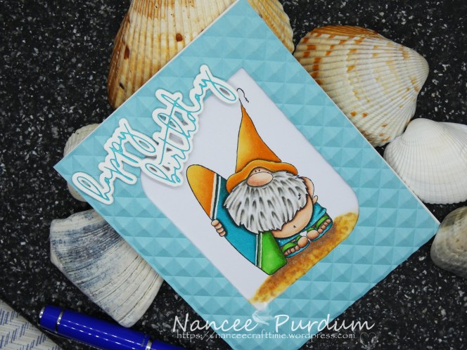 Don’t you just love Gnomes! Stamping Bella has some great Gnome stamps. Gnome with a Surf Board is so cute and can be used for just about any occasion. I decided to use it on my latest birthday card.