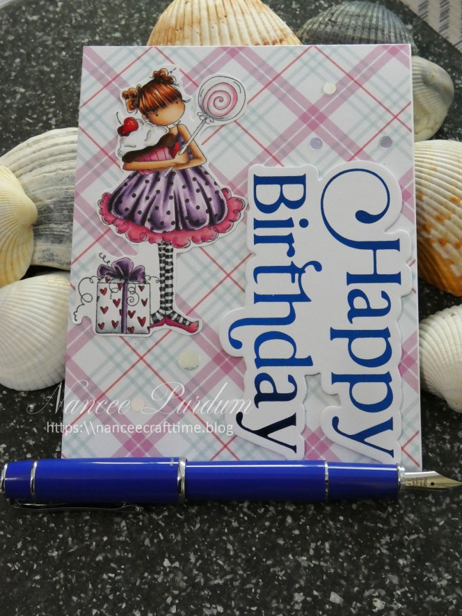 My sentiment is from Pinkfresh Studio, Happy Birthday and matching die. I hot foiled it with blue foil. The foil doesn’t photography very well.