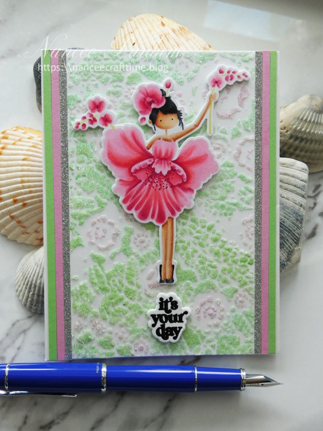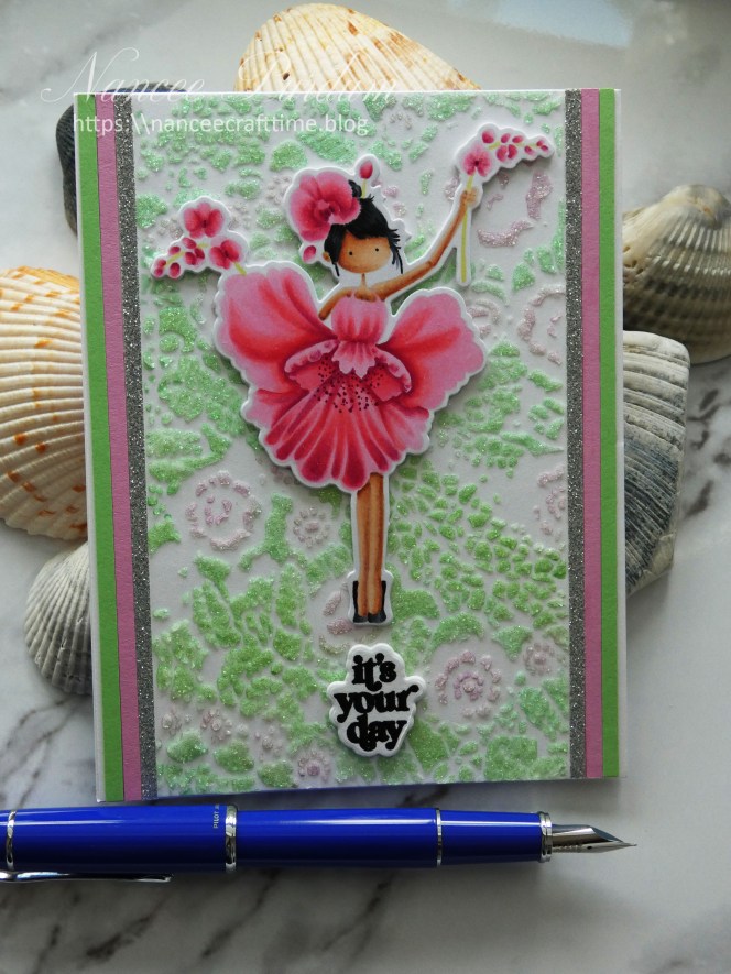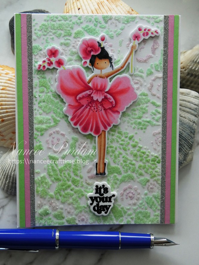 I used Simon Says Stamp Pawsitively Saturated ink in Spring and Bubblegum to the color. Once I was satisfied with the colors, I went over the entire stencil with Tonic Nuvo Glimmer Paste in Moonstone to give it some sparkle.