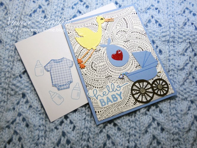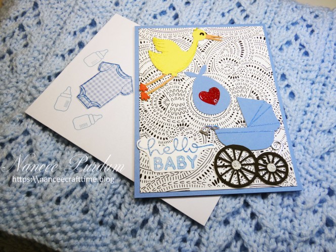I wanted a different background for my card and used one of the plates for it. I had some very old dies that I was going to use to create a scene. I die cut the stork, baby buggy and storks bundle several times out of different colored paper. I then pieced the images together instead of coloring them with ink or Copics. I also decorated the envelope using an older stamp set that I had. I die cut the little outfit from some pattern paper and added it to the envelope and inside of my card.