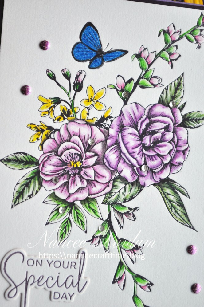 I used Mulberry ink for my sentiment. For the butterfly, I added some sparkle using Sky Blue and Baby Blue AtYou Spica pens.