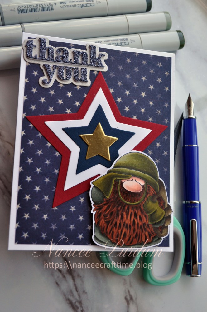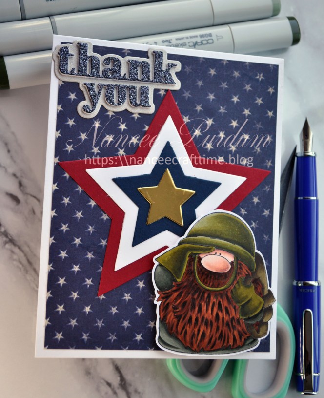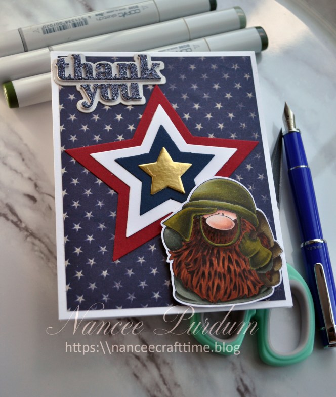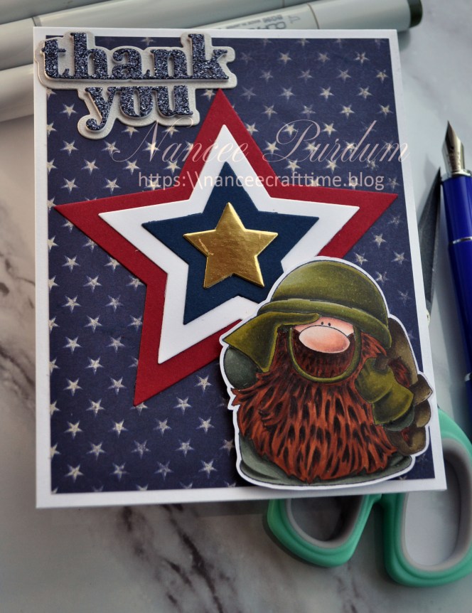 For my Thank You, I created this card. I used Stamping Bella’s Gnome Solder as the image for my card. I colored the image with my Copic markers and cut it out using my Scan N Cut.