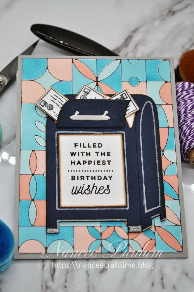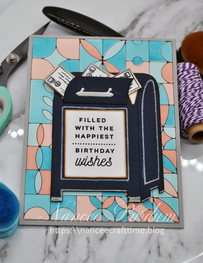 I mounted my panel to a piece of gray cardstock. I then used Spellbinder’s Parcel & Post Mailbox to die cut the mailbox and letters.