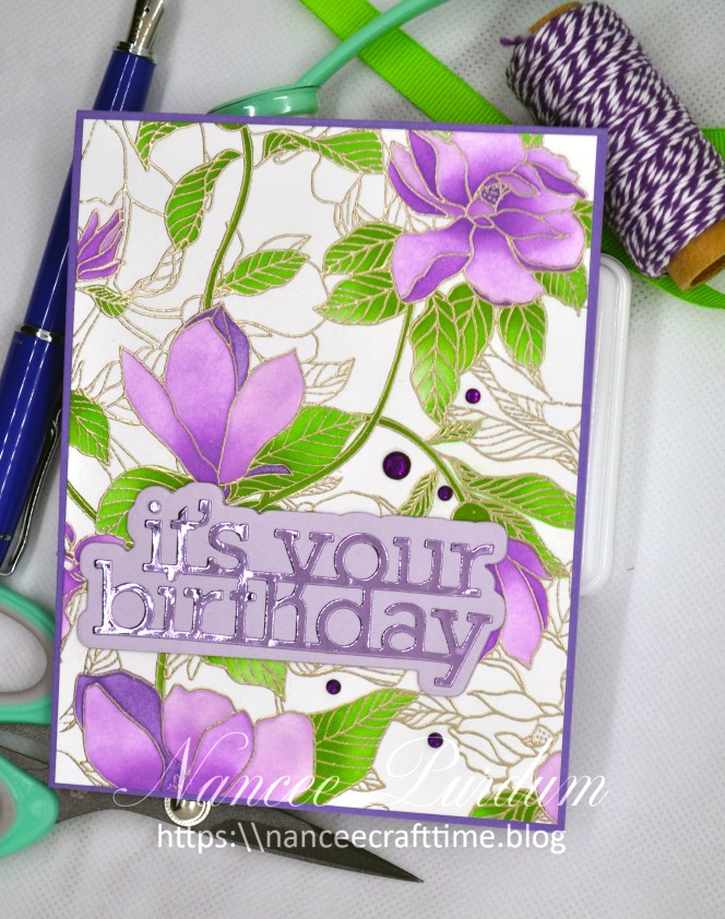 A little something different today. It is a birthday card, but done with only foiling, a stencil and ink. The background stamp and stencil are Magnolia Pattern from Pinkfresh Studios.