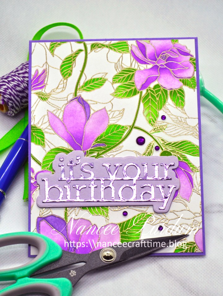 A little something different today. It is a birthday card, but done with only foiling, a stencil and ink. The background stamp and stencil are Magnolia Pattern from Pinkfresh Studios.