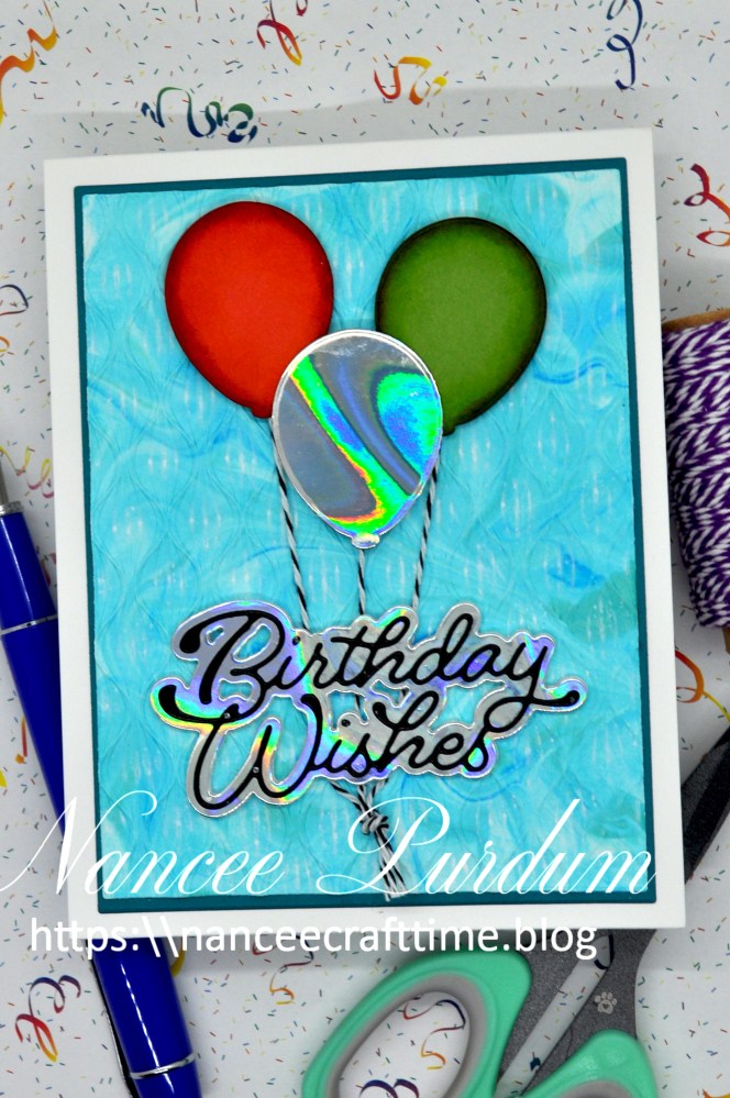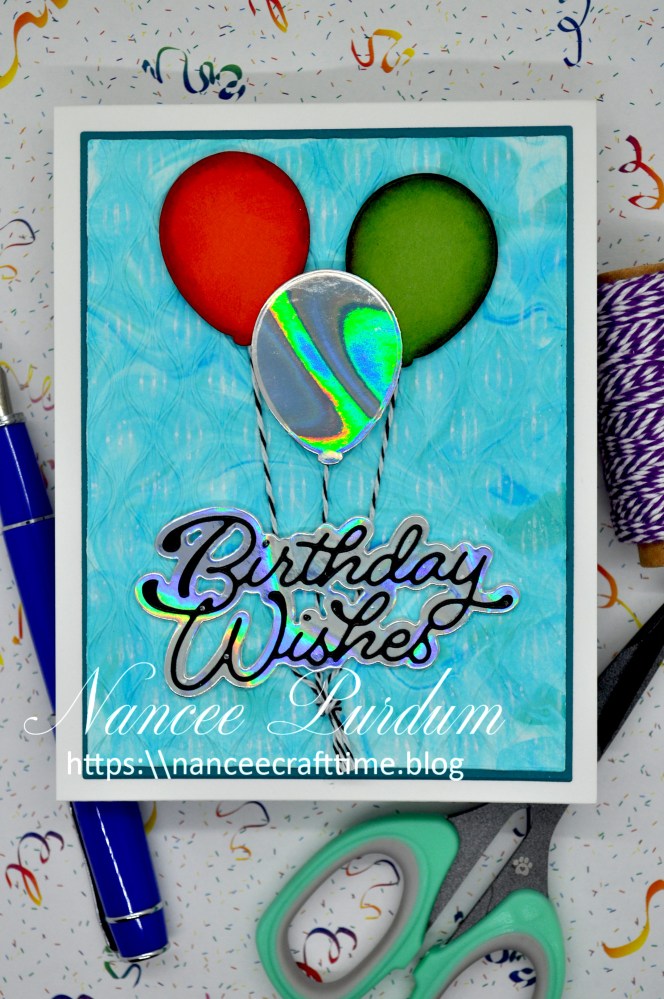 My sentiment is Birthday Wishes Moonlight Script from Poppy Stamps. I cut the sentiment using Black Glossy cardstock from Simon Says Stamp and another piece of the holographic cardstock for the shadow. I used Master Layouts #1 from Gina K to cut out my background and a mat out of Tranquil Teal cardstock from also from Gina K. I popped the holographic balloon up with some foam tape and attached some string to the balloons before adding my sentiment.
