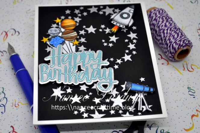 For my card, I used Hocus Pocus stencil from Tim Holz. Instead of using ink, I added Silver Lining Lunar paste. This really gave the black card stock some shine and a little bit of depth. I used several images from Catherine Pooler’s The Universe is Calling and colored them with my Copics. I had originally received that stamp set as a part of a monthly club for journaling. I thought the images would go perfectly with my starry background.