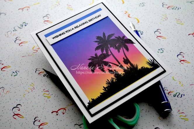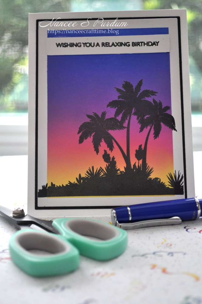 I then used a stamp from Ocean Silhouettes by Gina K to create the scene. Once I had created the scene, I cut a border panel, again using Master Layouts 1 to adhere my panel to. I then placed the panel on a A2 card base. My sentiment is from Life’s a Beach by My Favorite Things stamped in VersaFine Clair black ink and then embossed with black embossing powder.