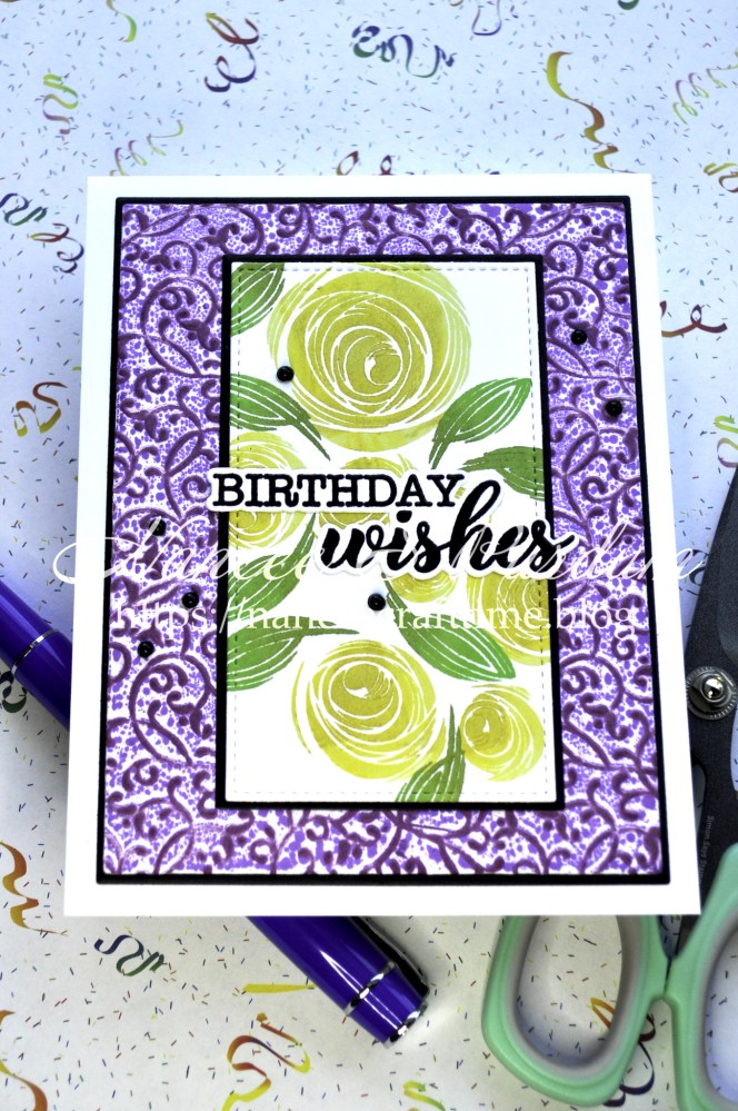 - My sentiment is from the same Modern Roses stamp set. I stamped the sentiment using black onyx ink and VersaMark Watermark ink and added clear embossing powder.