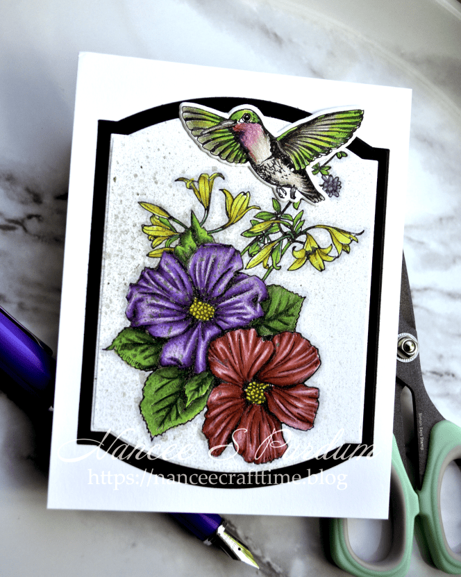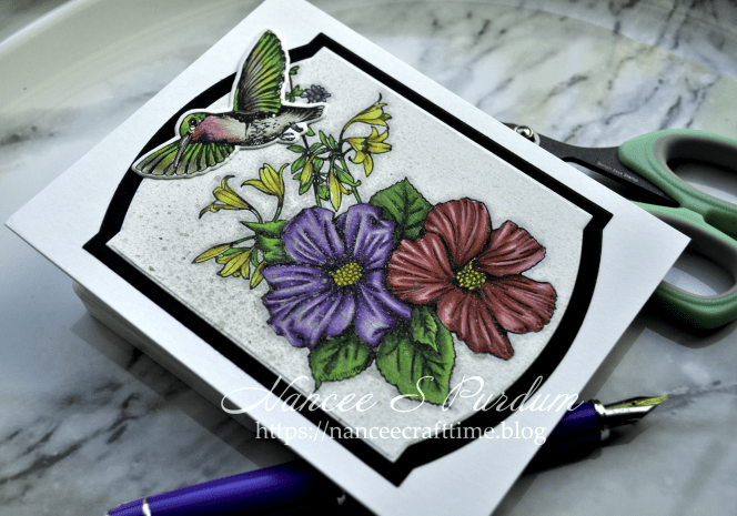 I added my floral image to the black mat and then added it to the card base. I then positioned the hummingbird and glued it down to the card.