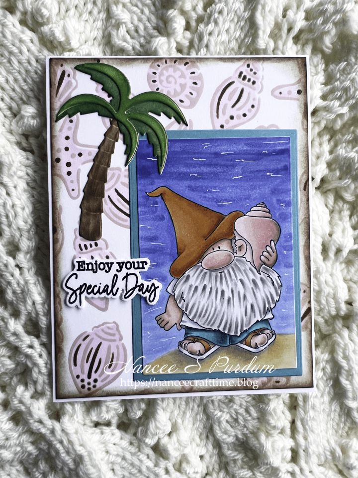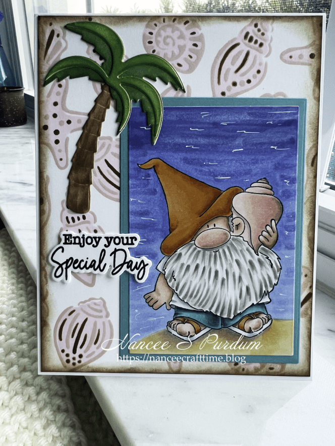 Today’s card has a beach theme. It features stenciling, stamping, Copic coloring and die cutting.