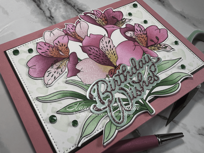 To finish off my card, I added some green jewels to the front of my card. I wanted a little sparkle on some of the flower petals so I went over some of the petals with my Nuvo Aqua Shimmer Gloss pen. This completed my card.