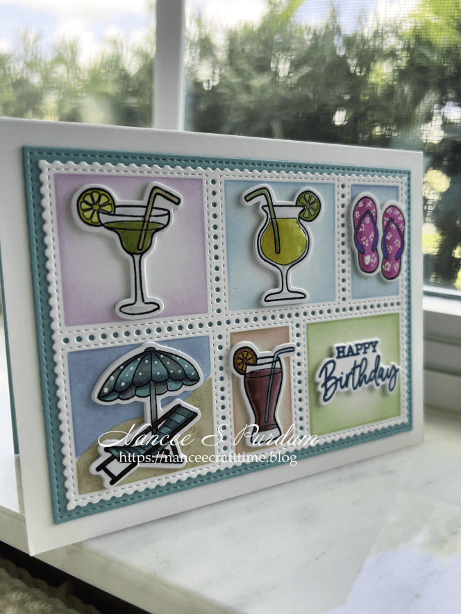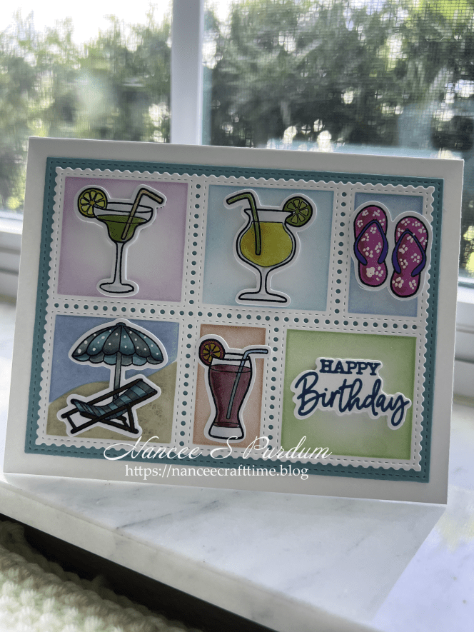 I have a lot of smaller images that seldom get used. With the “Postage” die and stencil sets by several companies, you can use those smaller images to create a cute card for any occasion. I have previously used the postage die sets to create Thank You cards. Today’s card uses them to create a birthday card.