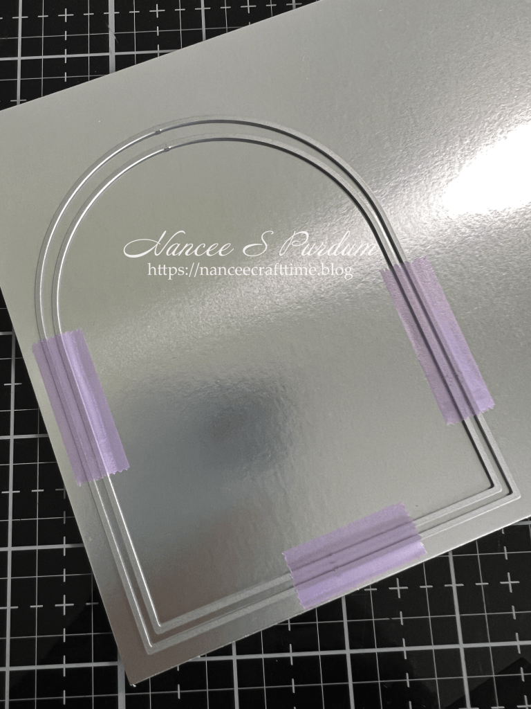 - I arranged the dies on some silver cardstock and ran it through my die cutting machine. This created a thin frame to go around the opening on my blue panel.
