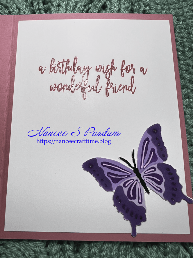 For the inside panel I stamped and heat embossed my greeting. I also added a butterfly from my “left- over” stash from another card.