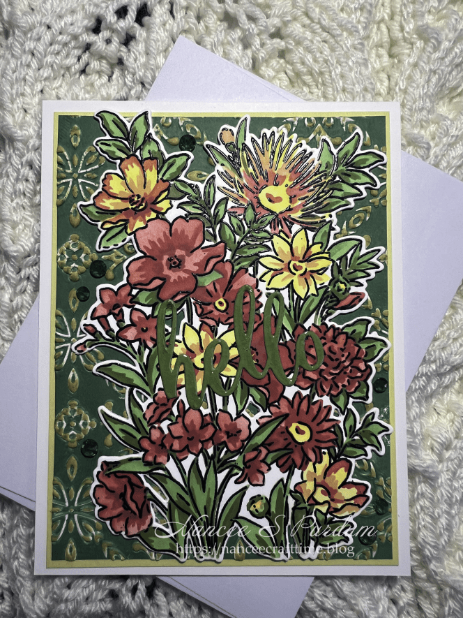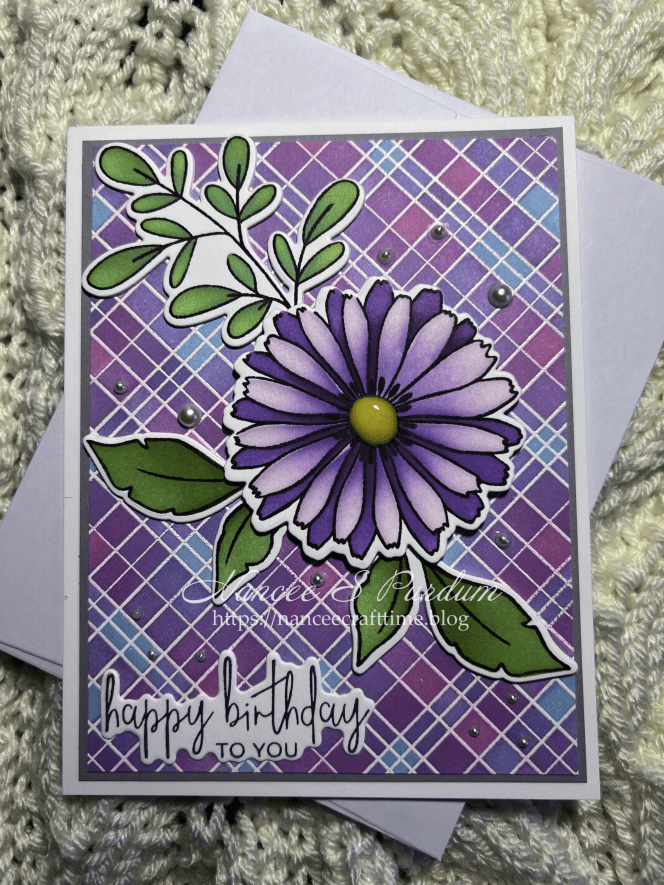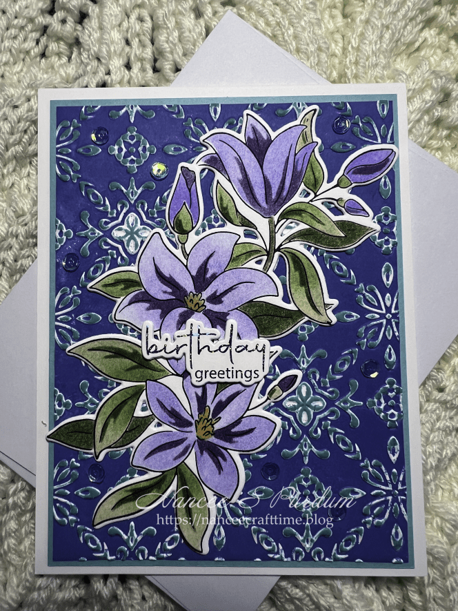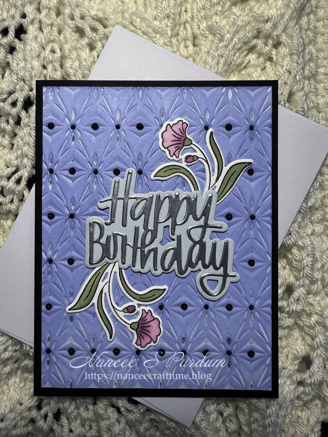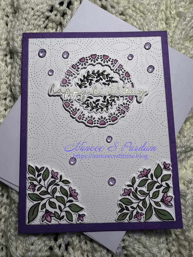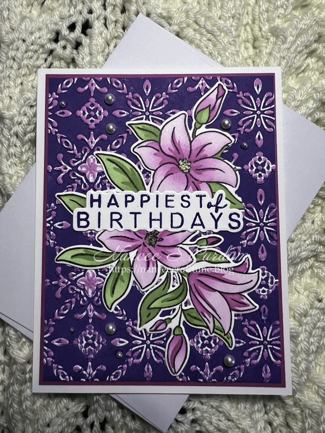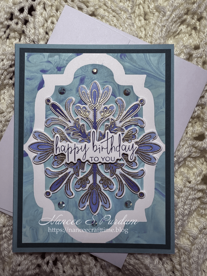 Hocus Pocus – Tim Holz; Glitter Glitz Gel – Gina K; Happy Birthday Die and Hot Foil Plate – Pinkfresh StudioTim Holtz alcohol inks – Celestrial, Tranquil, Villanious, Intrigue, Enchanged, Snow Cap, Silver Metallic MixativeDainty Plaid – Pinkfresh Studio; Delicate Flowers – Gina KDetail Bohemian Plate (background) – Simon Says Stamp Moroccan Tile 3D embossing folder – AltenewShaving cream background with Snowflake Mandala heat embossed – Gina K; Botanical Bunch – Pinkfresh StudioMoroccan Tile 3D embossing folder – Altenew; Delighted for You – Pinkfresh StudioTwirl It Gingham – Gina K; Intricate Stitched Ovals – Pinkfresh StudioKaleidoscope – Pinkfresh Studio; Birthday Cheer – Gina KMonstera Frame embossing folder – Altenew; Tropical Friends – Spellbinders; Best Year Yet – Simon Says StampSparkling Facets embossing folder – Simon Says Stamp; Happy Birthday Brush Script – Simon Says StampSparkling Facets – Simon Says Stamp; Best Wishes stamp and die – Waffle FlowerShaving cream technique background; Layering Vintage Labels masked off – Honey Bee; Folk Snowflake – Pinkfresh StudioShaving cream technique with masking; Folk Snowflake – Pinkfresh StudioPressed Bouquet Betterpress – Spellbinders; colored pencilsMoroccan Tile 3D embossing folder – Altenew; Botanical Bunch – Pinkfresh StudioShaving cream background technique with masking; Folk Snowflake – Pinkfresh StudioBrick Wall – Gina K; Lunar Paste Twirl It Gingham – Gina K; Quilted Backdrop – Lawn Fawn