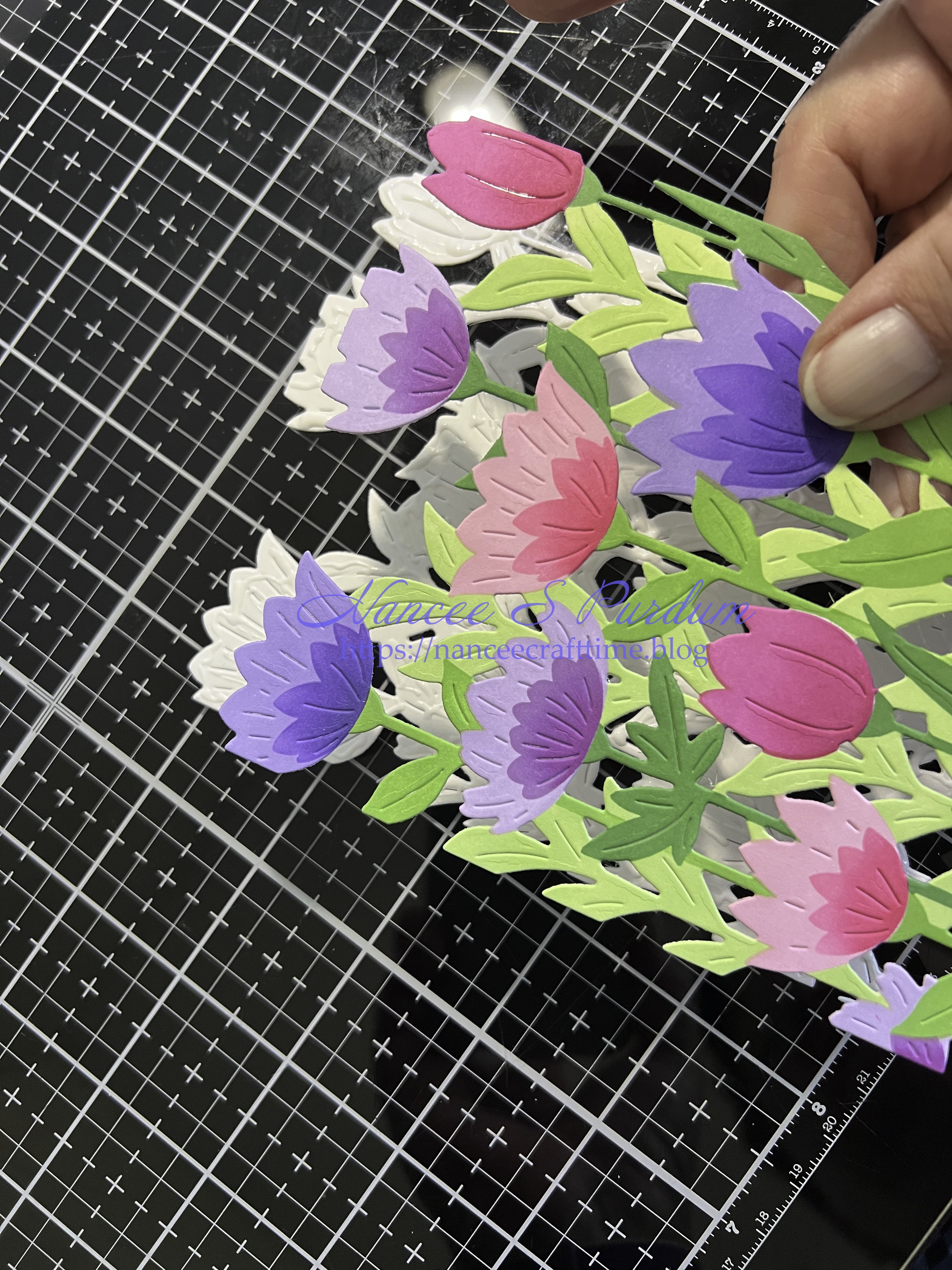 - I then assembled my card front adding the floral die cut to the background and then the frame around the outer edges.