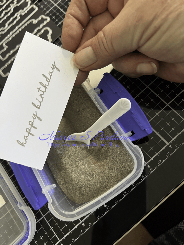 - I stamped my sentiment in Versamark Watermark ink, added gold embossing powder and heat set it.