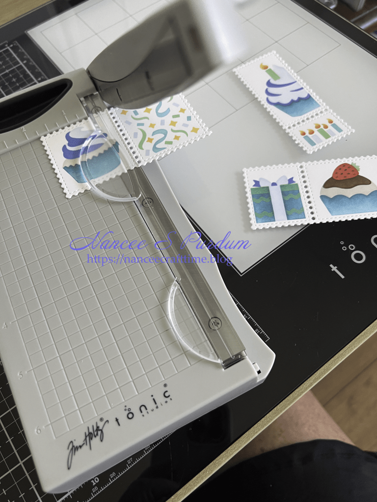 - I cut down some blue cardstock for each of the “stamps” to add as mats for each one.