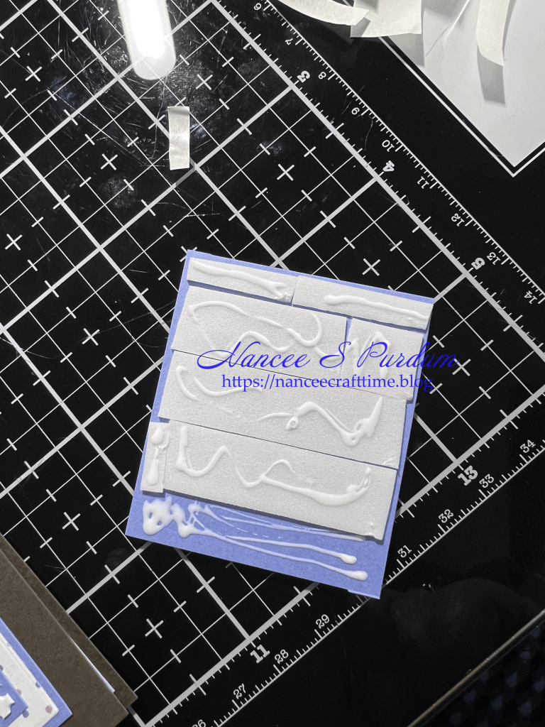 - Because the other three “stamps” overlapped the first ones I had glued to the card, I added some foam tape to those images where they did not overlap the ones already on my card base and glue to the areas that would overlap.