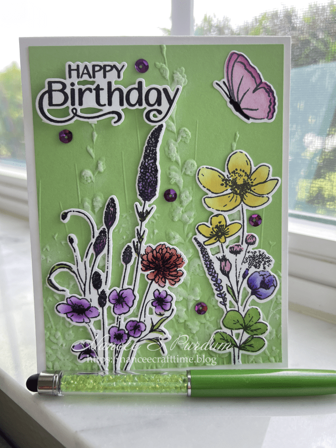 Today’s card is a simple card involving dry embossing, stenciling and die cutting. I needed to add more cards to my stash. This card uses several newer supplies that I had not used and some older items also.