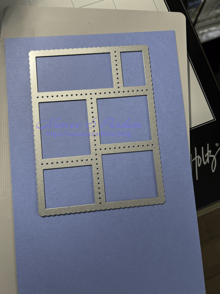 - My first step was to use the Waffle Flowers Postage Collage Block die to create my “inner” panel for the “stamps”.