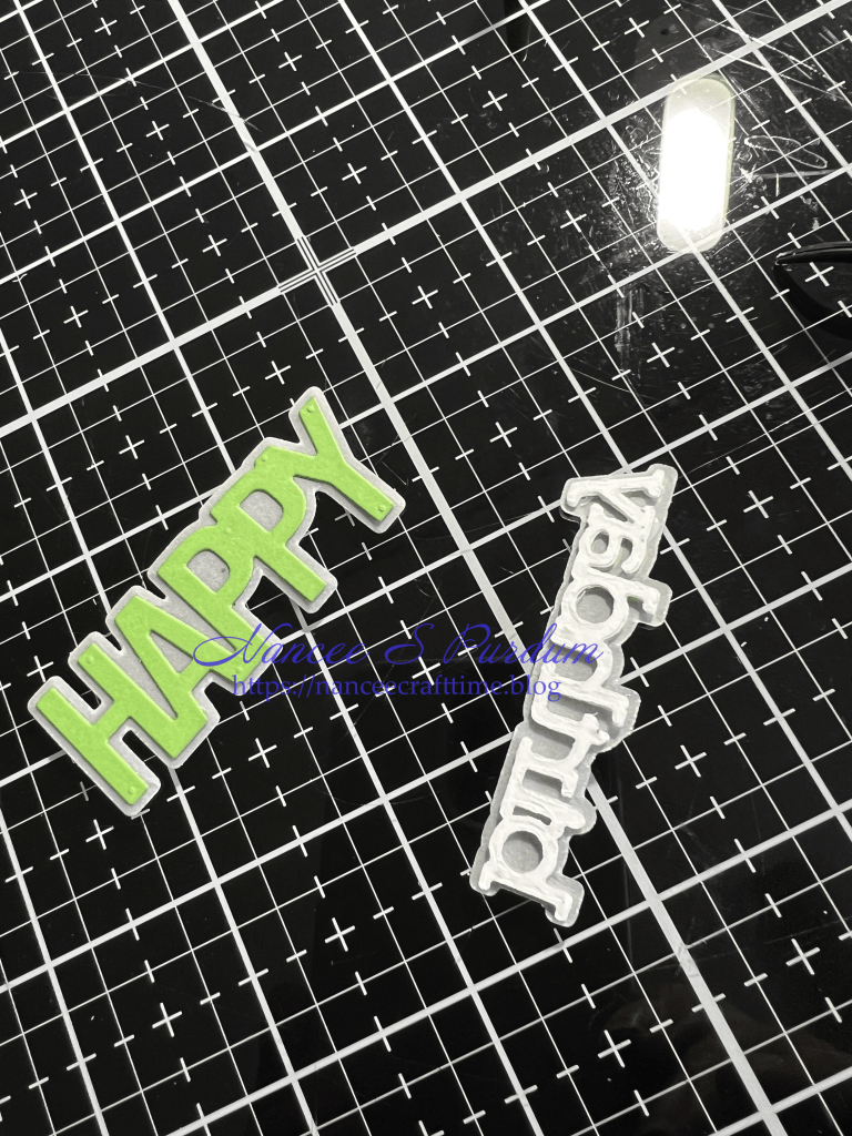 My next step was to create my sentiment. I die cut the words from the same paper I was going to use as a mat for my panel. I didn’t want to cover too much of the background, so I cut the shadow from some vellum. I wanted to raise the sentiment up, I cut some additional words from white cardstock. I glued them together and then adhered them to the back of the sentiments. Once I add them to my panel, they will give the appearance of “floating” above the panel.